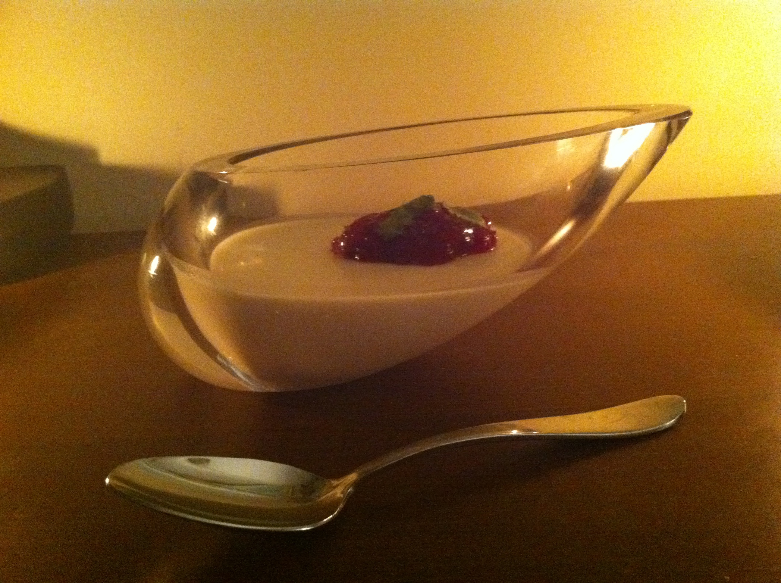 This is the dessert course I served as part of a tasting menu we did for a fellow chef. It was a summer pea cremeux, with a strawberry sorbet. I also added dollops of creme fraiche for a bit of tang and garnished with compressed strawberry slices and pea-shoot frawns.